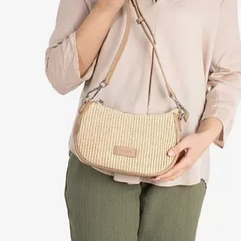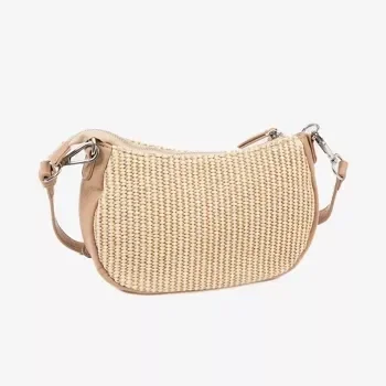Sac femme, couleur camel, série nijar. Fini en raphia de haute qualité. Intérieur doublure textile avec une poche zippée. La poignée est de style bandoulière et possède une boucle pour un réglage facile de la hauteur. Conçu en Espagne. DIMENSIONS: 22x14x07 cm