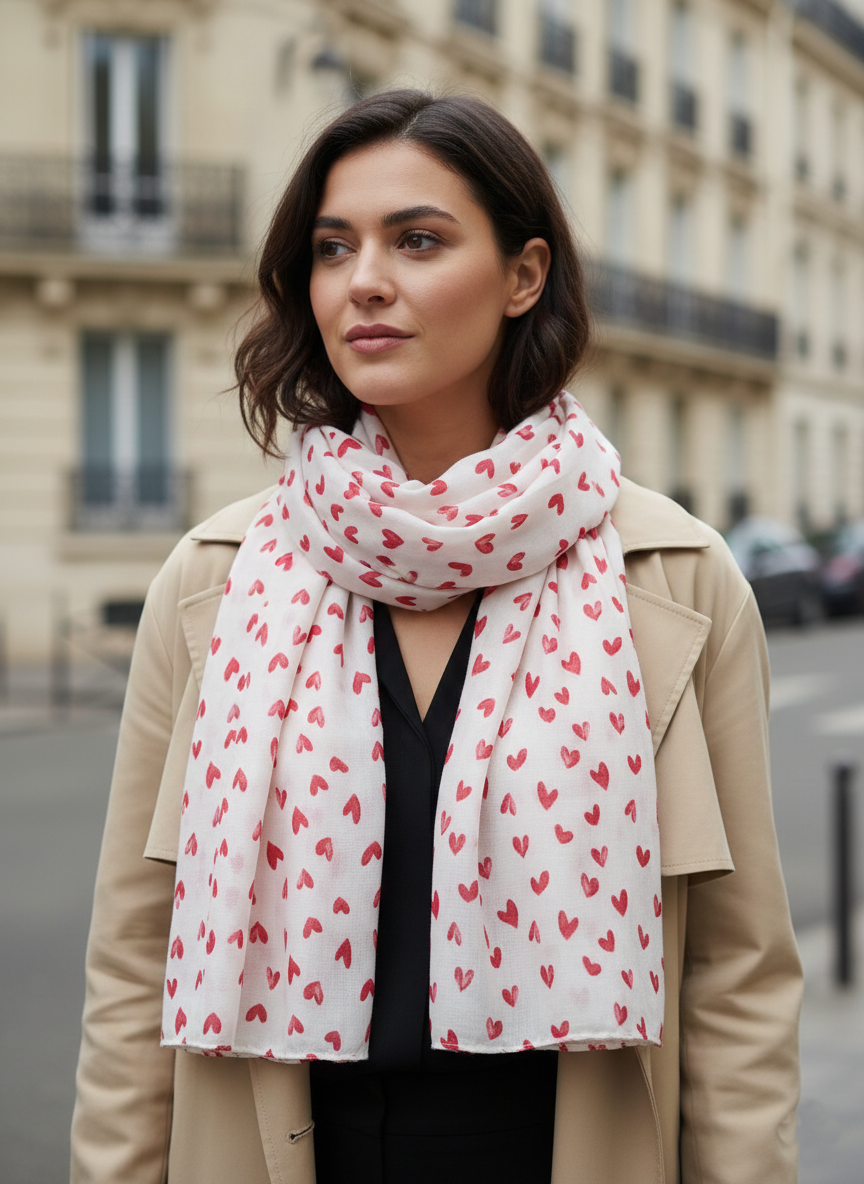 Foulard imprimé petit cœurs. Modèle 100% viscose mesurant 180cm x 90cm. Fabriqué en Chine.